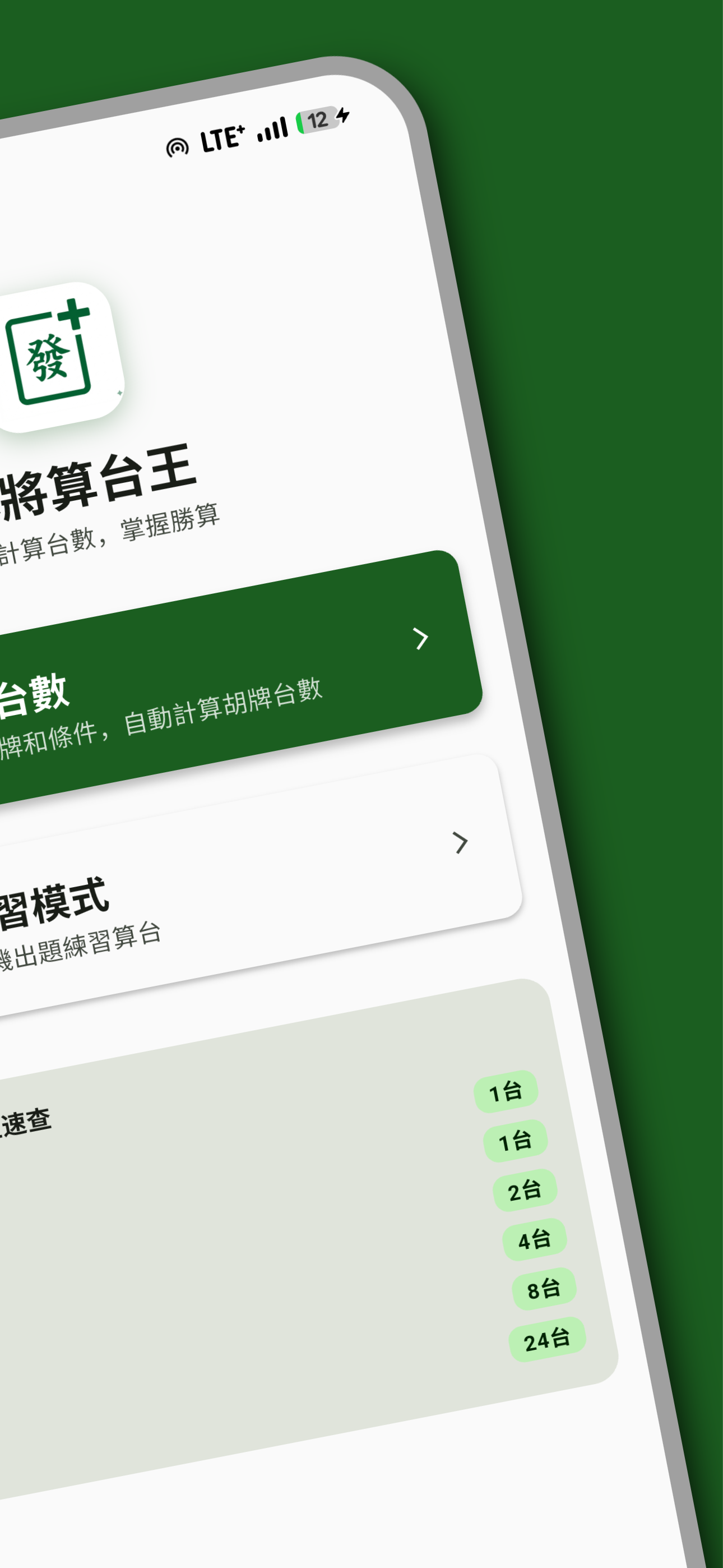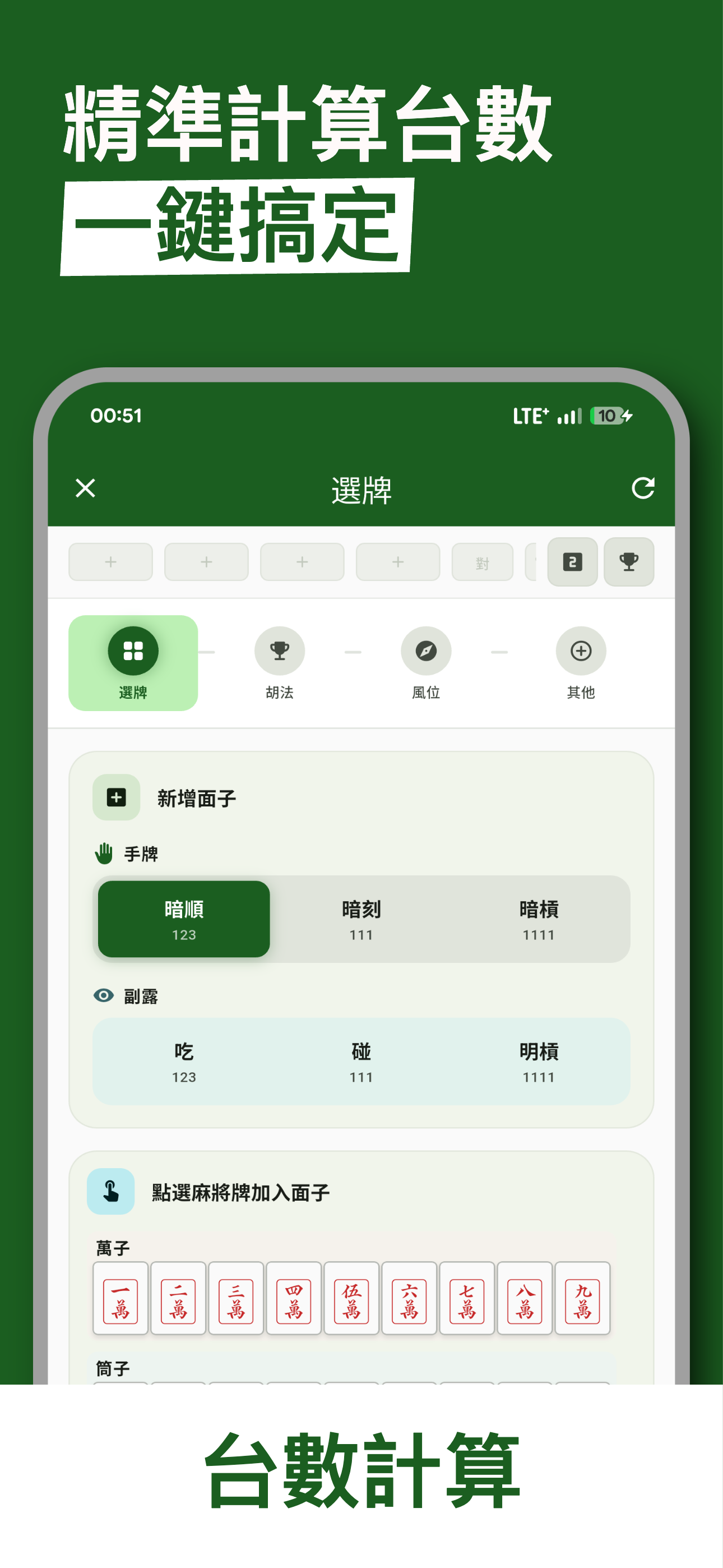 完整支援台灣16張麻將規則,自動計算各種台型組合,自摸、門清、風刻、花牌全包含。