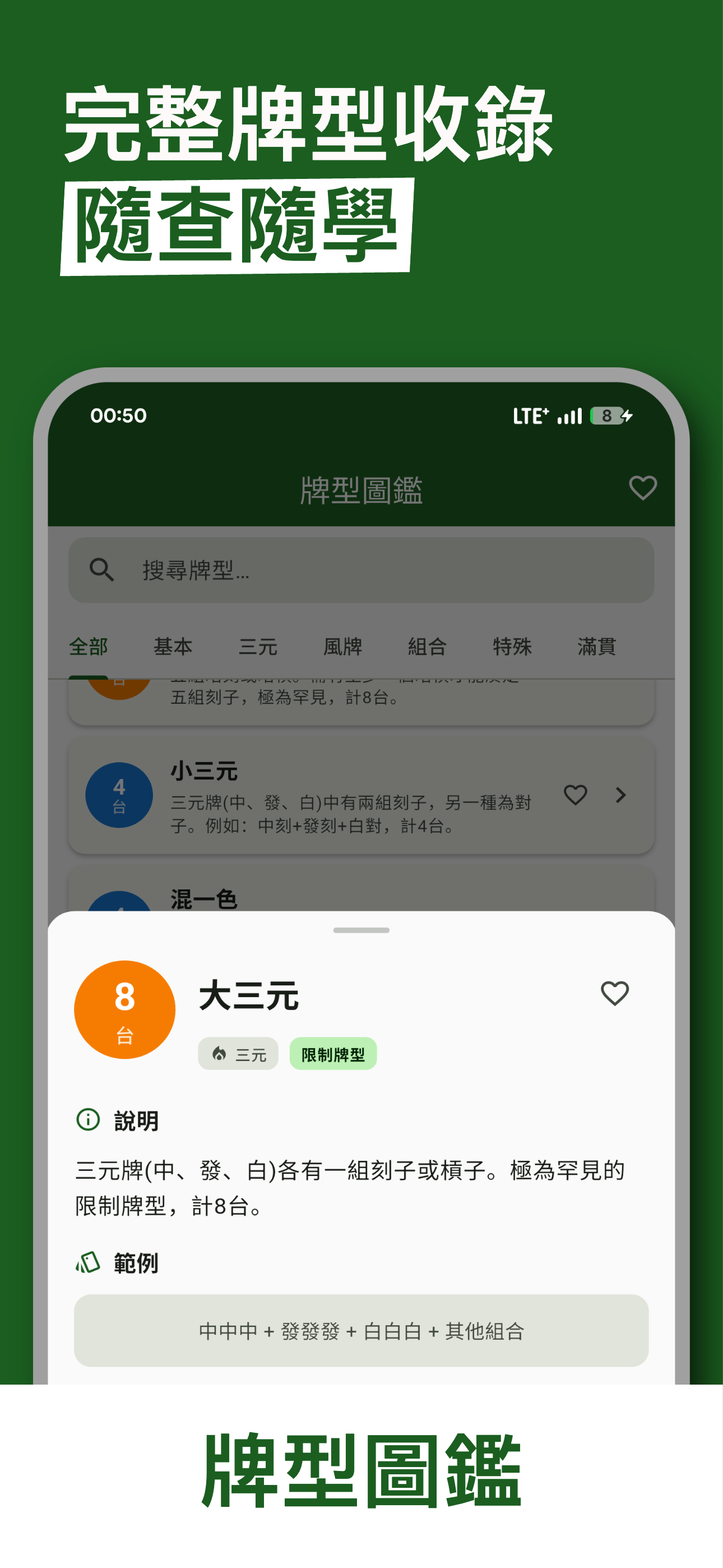 收錄所有台灣麻將台型,清晰分類快速查詢,附帶技巧說明與範例,支援收藏常用牌型。